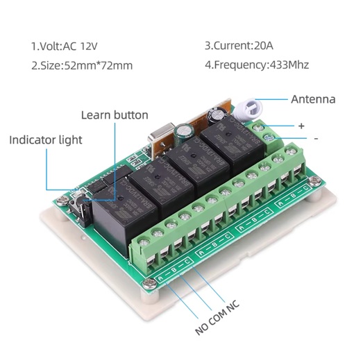 Daljinski upravljalnik in sprejemnik 4-kanalni 12V DC deluje na frekvenci 433 MHz in omogoča brezžično krmiljenje različnih elektronskih naprav. Sistem vključuje en sprejemnik in dva daljinska oddajnika s štirimi gumbi (A, B, C, D). Namenjen je za avtomatizacijo doma, upravljanje garažnih vrat, motorjev, luči in drugih naprav, kjer je priročno daljinsko upravljanje.