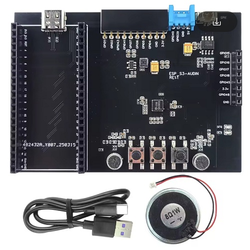 Namenska razširitvena plošča za ESP32-S3 z integriranim avdio kodekom, dvojnim mikrofonom in zvočnikom. Idealna za glasovne asistente.