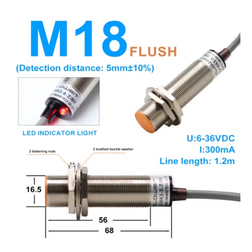 Zaradi robustnega ohišja z navojem M18 in priloženih matic je montaža hitra in stabilna. Senzor je odporen na prah in vlago (IP65), kar pomeni, da bo zanesljivo deloval tudi v težjih pogojih, kjer bi se optični ali mehanski senzorji hitro umazali ali obrabili.