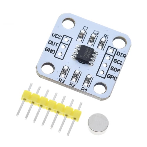 Ploščica je optimizirana za napajanje z 3.3 V in nudi izhodni pin OUT (analogni ali PWM), ter I²C liniji SCL in SDA za digitalno branje kota. Pin DIR določa smer naraščanja vrednosti (CW/CCW), pin GPO pa se uporablja za izbiro načina / programiranje modula. Priložen je magnet in ravna pin letvica, zato je modul pripravljen za neposredno vgradnjo v prototipe, mehanske gumbe ali doma izdelane potenciometre.